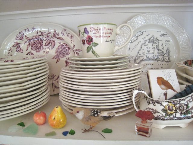 China….my favorite thing. When I moved into this house, my dad came and removed the doors on a tall hutch-like cupboard in our kitchen, that is where lots of it is. We have sort of collected storage here and there along the way, a dry sink, and a tall kind of pie-safeish sort of cupboard; it holds a lot. The pie safe and the dry sink are both in the dining room. There are two hutches in the living room!