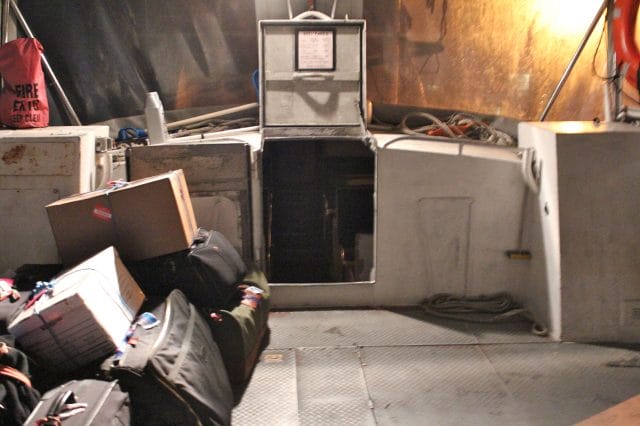 It was nice to see the moon. But it was very dark out there. We didn’t stay in the below-sea-water unlit room, we went up front with Captain Jim, so we had the view out the front windows. I kept my eyes, like a lasor, on the tiny lights of the island twinkling in front of us . . . we plowed through the waves, going up, down, slam! Up, sideways, down, slam! And so it went, salt spray blowing over the boat, metal parts echoing and clanking, floor shuddering, me holding on for dear life.