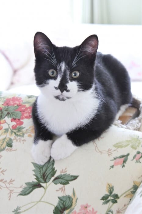 Please tell Girl Kitty that she is looking positively regal these days. Having a youngster to boss around suits her. She really is gorgeous. Our first Christmas with our black and white kitten was a hoot. My 6’6″ husband was putting the lights on the tree when a little face popped out at him from the top of the tree. Both of them yowled and there was quite a bit of thrashing by man and kitten. Our little fella never climbed Christmas tree again, choosing instead to spend the next 15 Christmases ensconced on the tree skirt and gazing up through the branches. There is nothing quite like a kitten in the house!