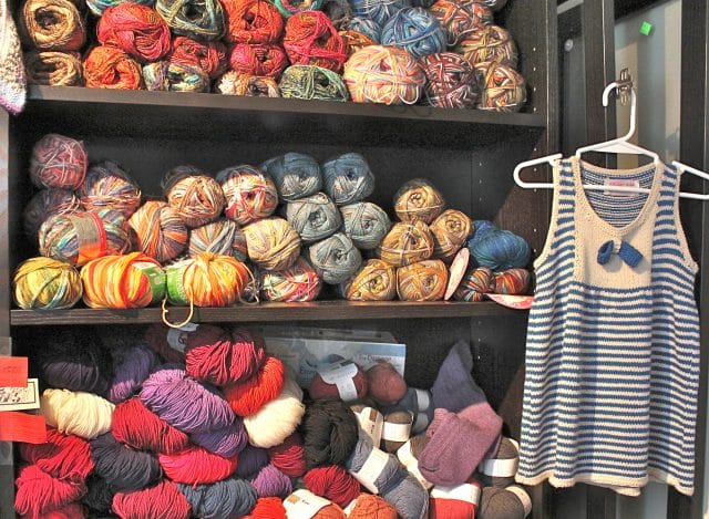 This little project was on the kitchen table, a hat, being knitted by Michaela, one of the women working there. Look at the beads she’s knitting in! Isn’t that adorable? You can just catch a glimpse of this whimsical variegated yarn in the lower left of the photo. I visited with Michaela while looking around the store for the perfect little project for me. First requirement: it must be something that requires absolutely no knitting knowledge.
