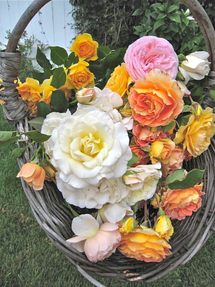 Here are some special roses I’ve had good luck with; a glorious peach one called “Just Joey” and the prolific yellow one called “Julia Child.”  These are the ones that send me to the moon . . .  both of them bloom and bloom, and are deeply scented.  Put your nose in there and stay awhile!  The gorgeous white one is “Iceberg.”  But none of these is a climber.