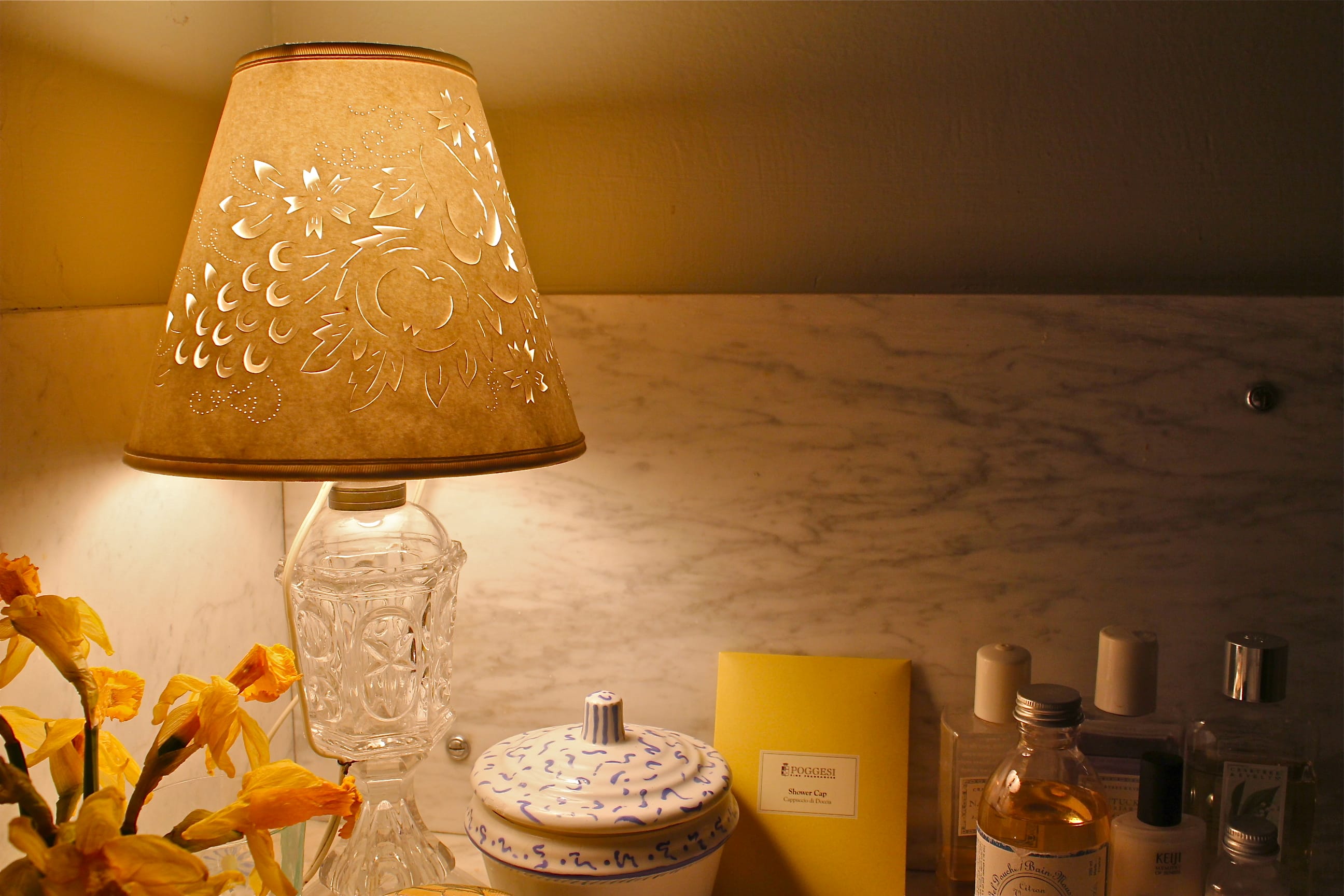 Lamps in guest bathrooms make a beautiful soft light, and keep the ambience going at a dinner party, instead of your guests going in and flipping on a strong overhead light, they find this.