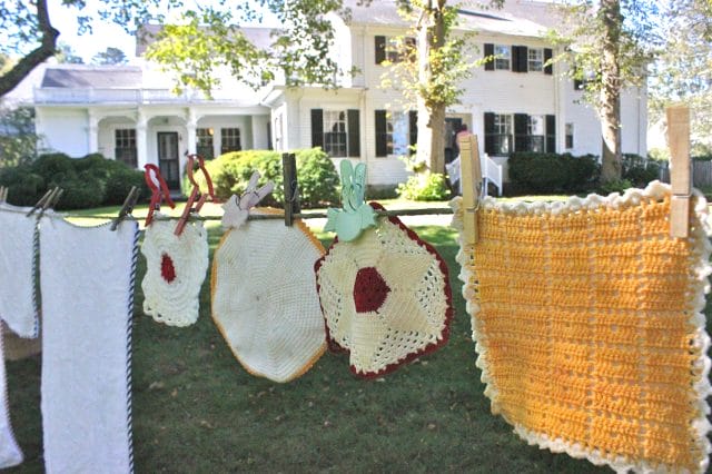 These linens are hanging on a quilt rack — so handy for everything, from quilts, to drying towels in guest rooms, so if you see one, you might want to get it … I found a green one on our New England trip for $35. Oh yes!