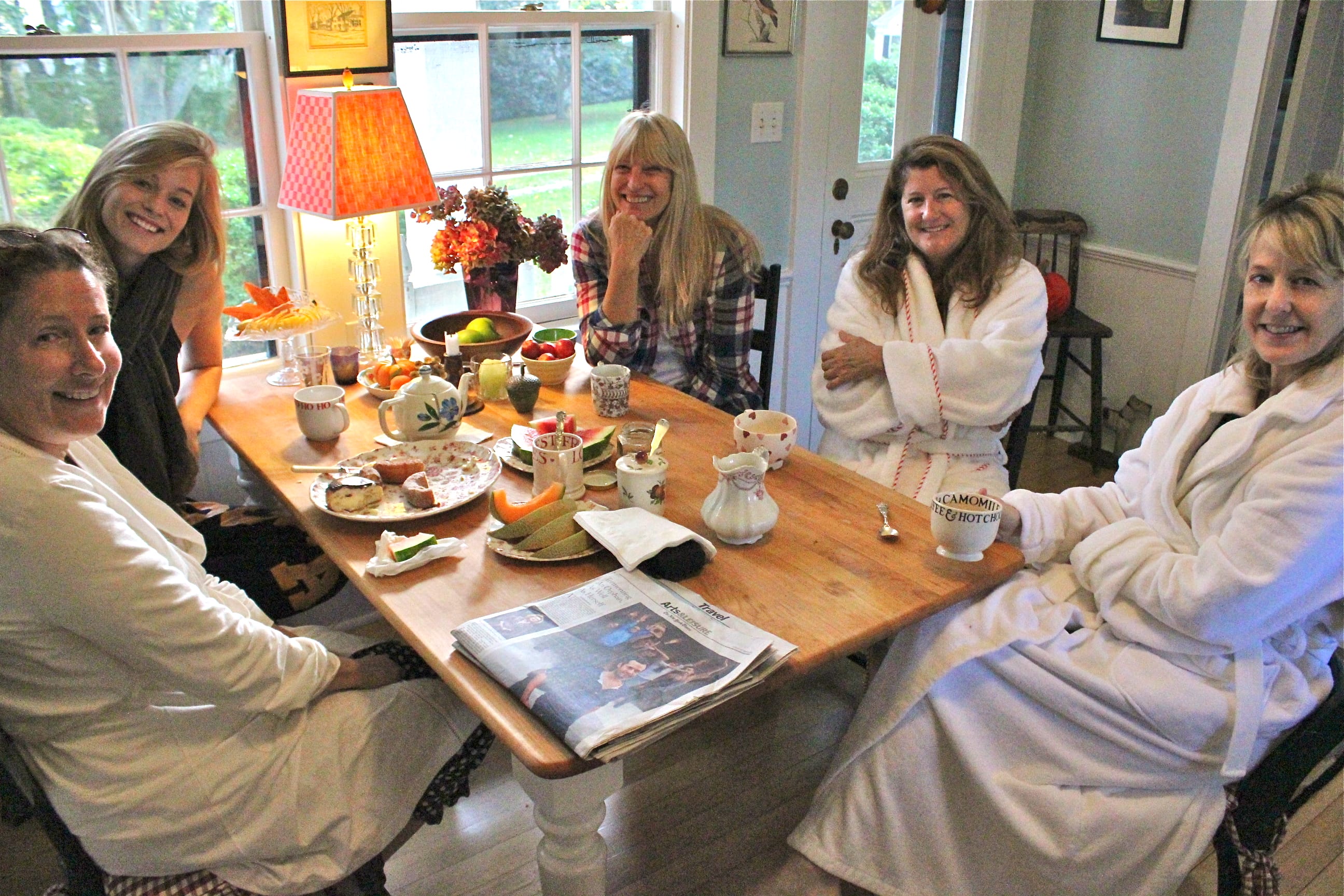 Such a fun and cozy post! Loved seeing the girlfriends sitting around the breakfast table in their bathrobes! Looks like Fun times! Lots of memories were made, I’m sure! Thanks for introducing them to the rest of us! I’m just beginning my collection of old linens, starting with my Mom’s linen tablecloth and napkin set. Embroidered dishtowels and dresser scarves are my favorites. I’m going to a bazaar next week-end, with my daughter, at a senior center where, last year, they gave away free doilies with every purchase! How charming is that?? Hope they still have some left for this year! LOL!