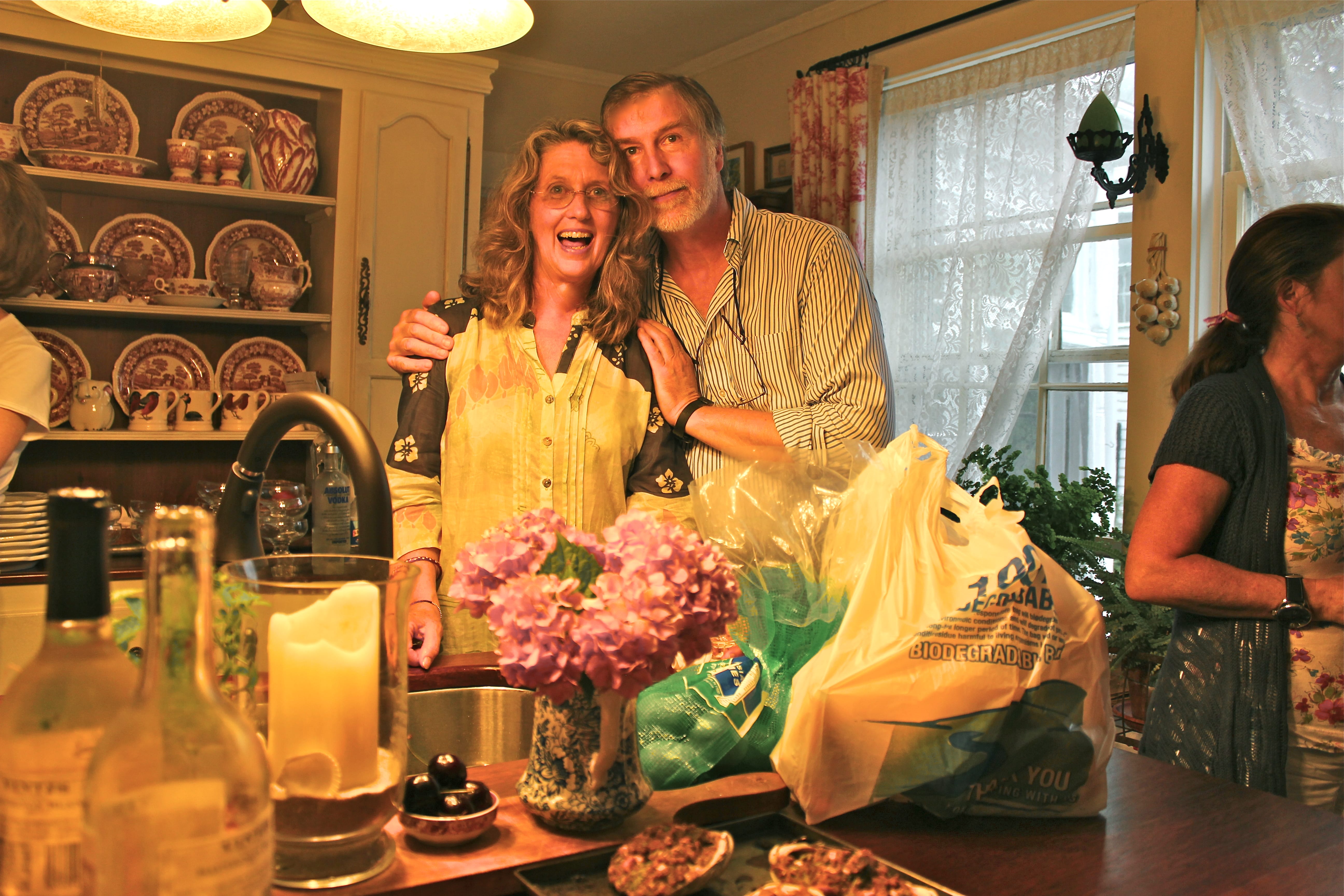 But here she is with Joe — we’re at her house, for one of her wonderful parties!  See those yummy Clams Casino in the foreground.  I would like one of those right now!  (Thank you Lowely, for letting me use these photos and for the constant wonderful entertaining YOU! )