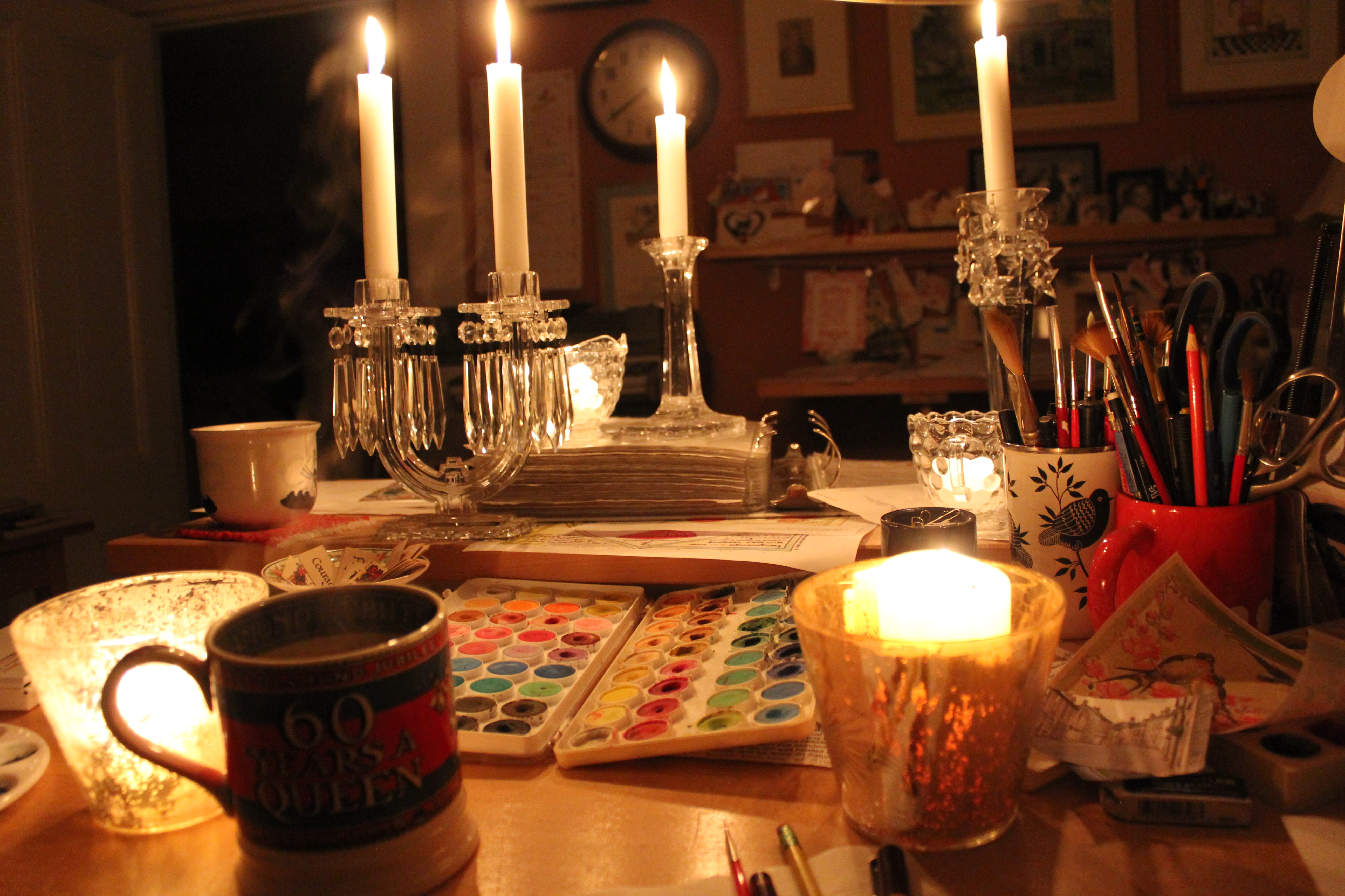 I made tea on our gas stove (thank goodness for gas stoves!), wrapped up in shawls, Tweeted a little bit on my iPhone which I had charged last night — I knew Twitter would be my only contact with the outside world and it was! And then I went to work like “normal” — and here is what I learned: not being warm is one thing, but watercoloring in the dark is just plain dangerous!