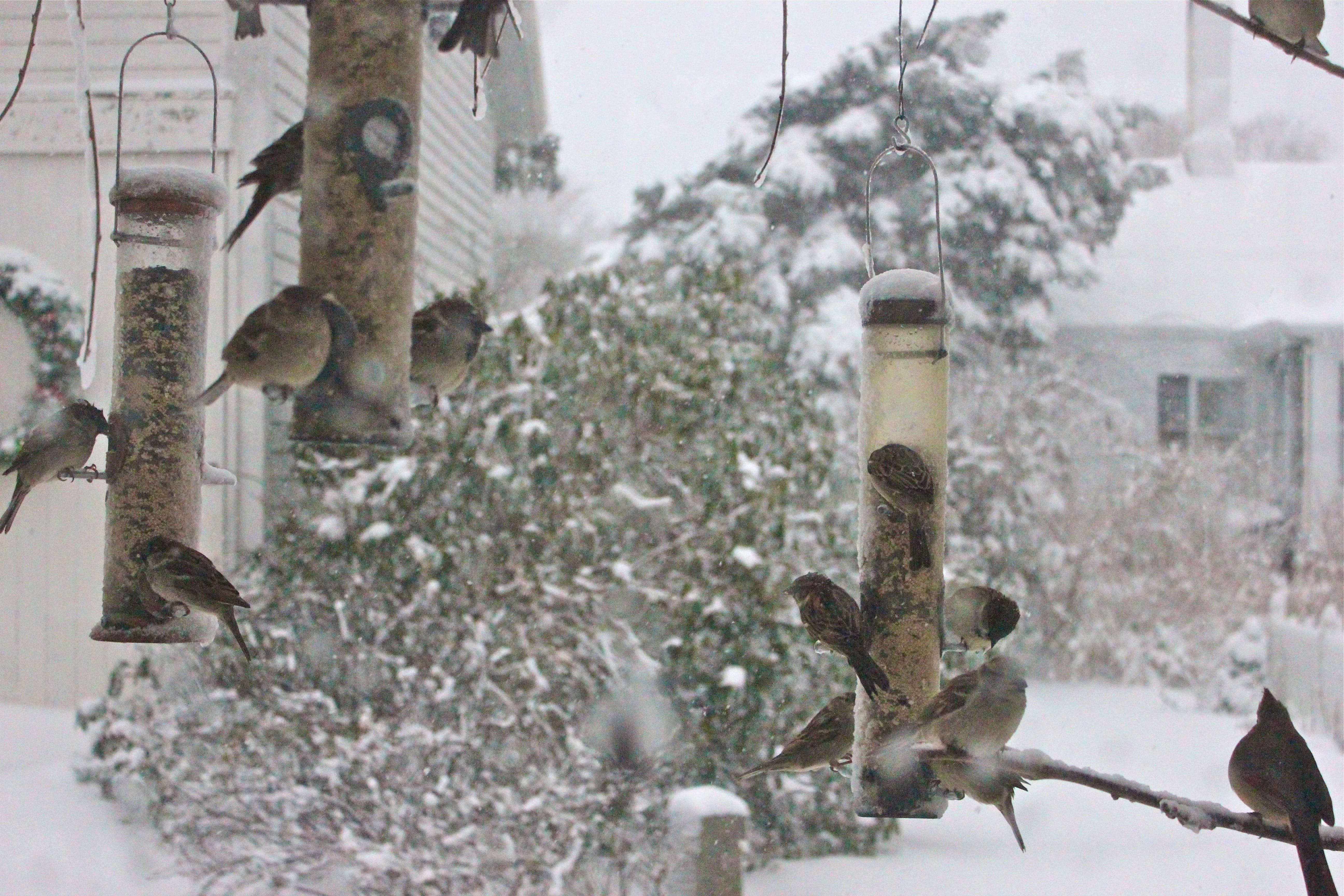 And I could see the poor birds. They looked like they’d had a rough time of it, their feathers were wet, and poking up on the tops of their heads, even the ones that weren’t cardinals! I felt bad for them.