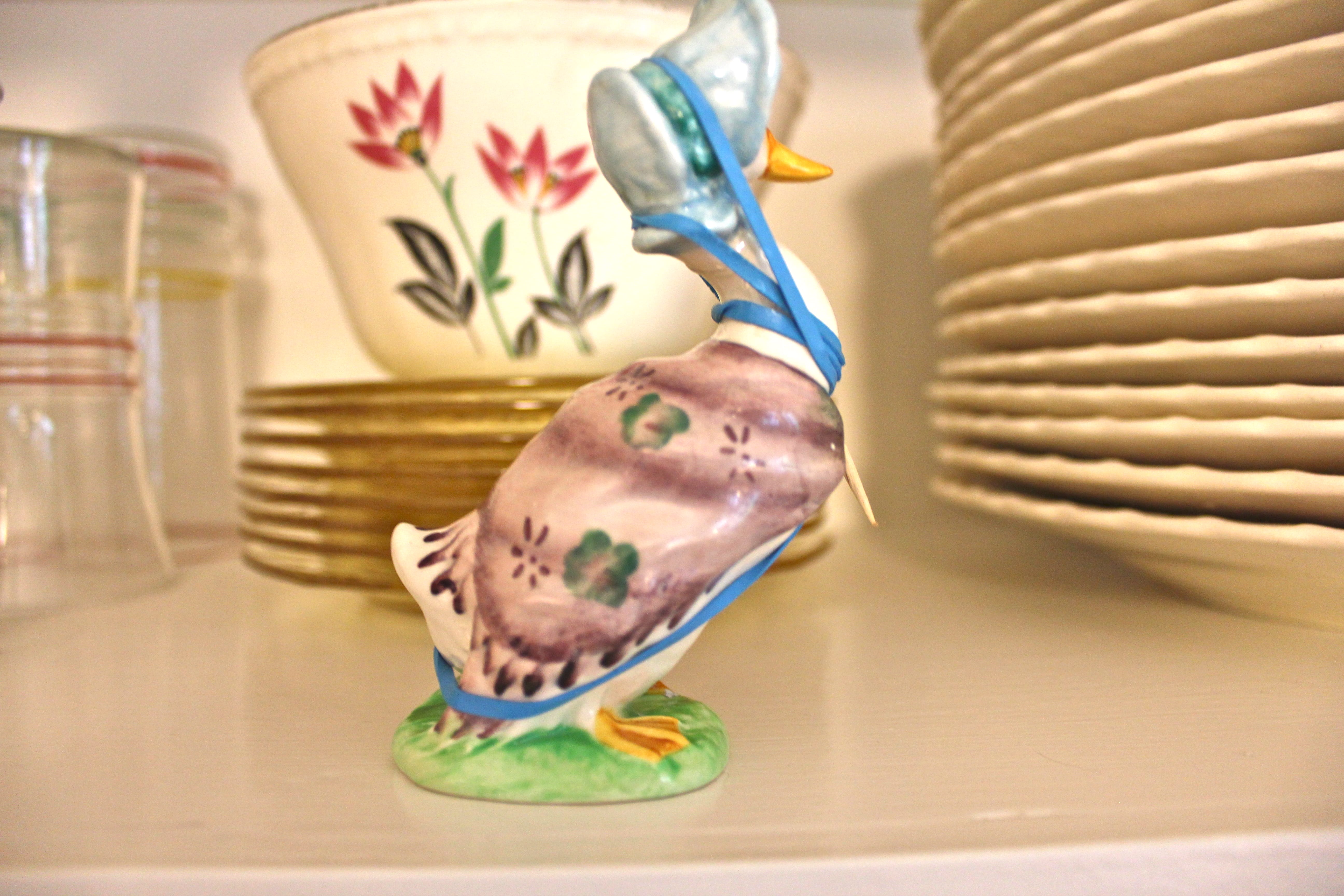 Because I love to look at my Beatrix Potter figurines every day, I keep them in a precarious position on a narrow shelf above my kitchen sink. It’s only precarious because that’s where Jack hangs out. The bird feeders are right outside the windows.