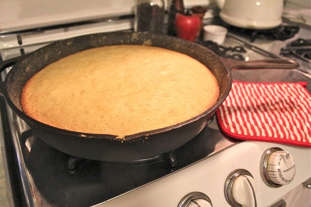 This cake serves a lot of people ~ twenty four! It’s perfect for a party, but you can also halve the recipe very easily and bake it in a 9″ cake pan. I wanted the big cake for our Tea Party but I don’t have the called-for 12″ cake pan, so I bake mine in this 12″ iron frying pan, which works perfectly.