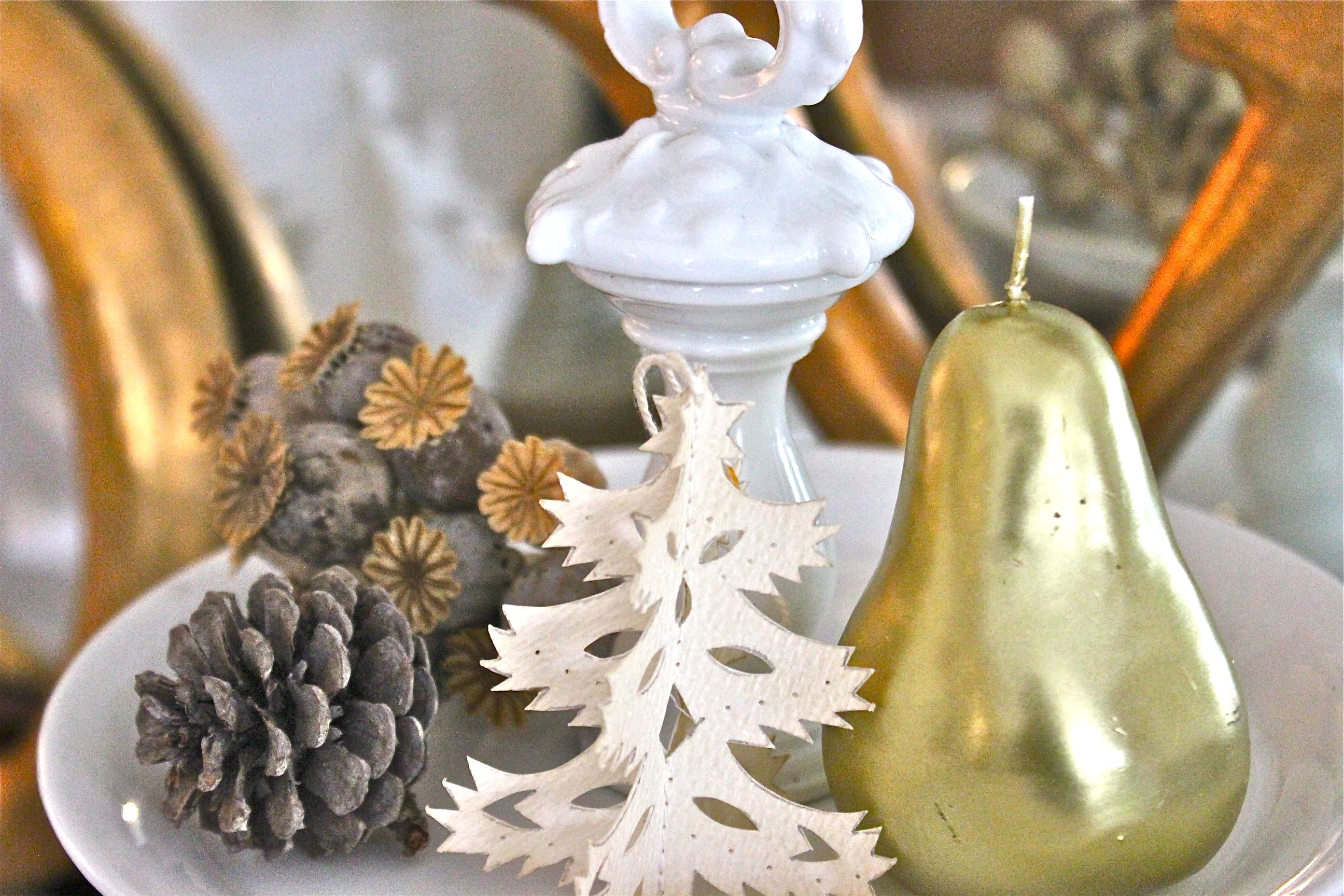 Themes began to come to mind. I was thinking, “winter wonderland” for the dining room. I scoured my attic, the barn, and every room in the house looking for white, sparkly, vintagey, wintery things. I found this white bird with the gold trim on his wings and old packages of snowflake gift tags I hadn’t used and tied them onto some gold beads to make a garland over the mirror of our sideboard, Lucite stars too . . . stars, birds, snowflakes, winter wonderland in nature.