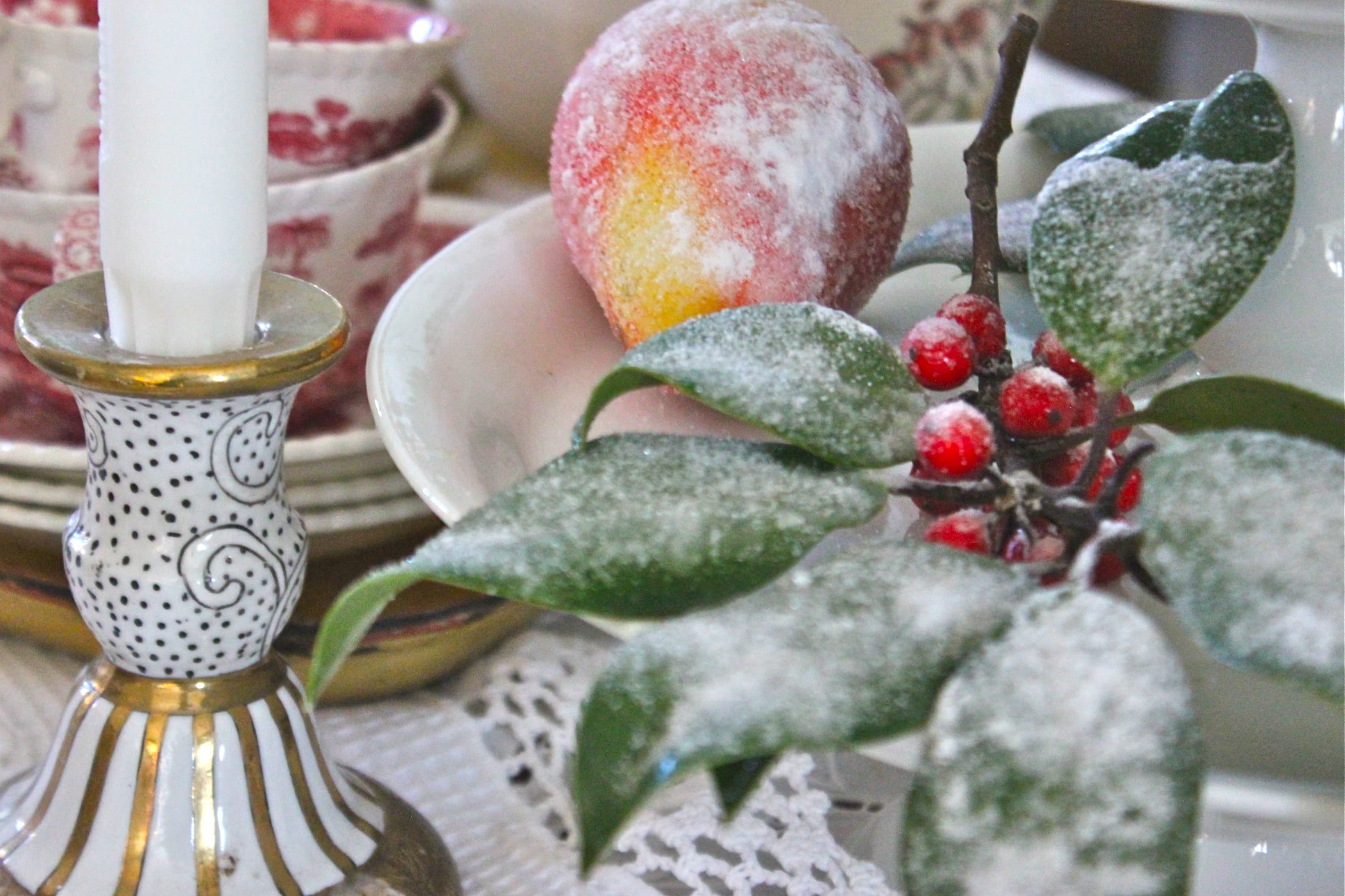 I made sugared fruit and thought I’d try doing holly the same way. It worked! You can do it too, brush everything with a thin coat of egg white, dip the fruit or holly in granulated sugar and then superfine sugar (which you can make in your food processor or blender if you can’t find it at the store) and allow everything to dry overnight.