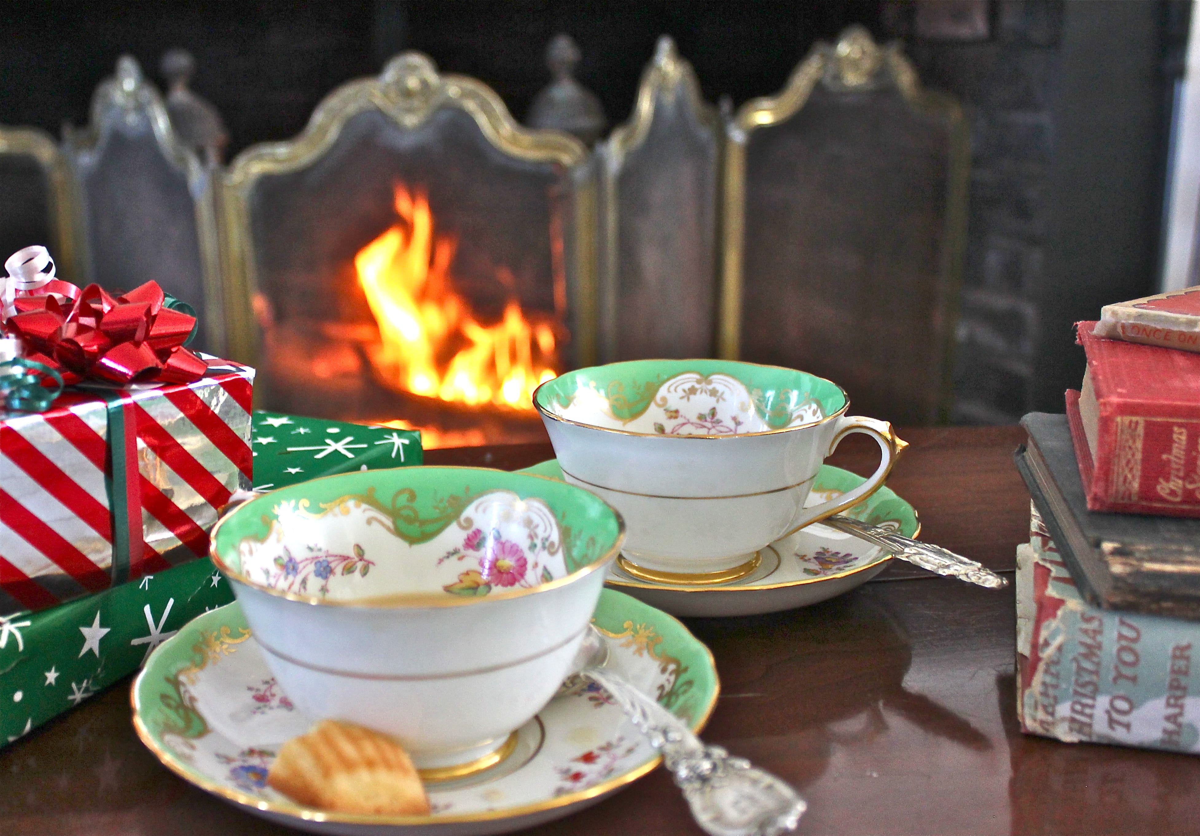 The click of cups in saucers, crackle and pop of fire, rustle of tearing wrapping paper, buttery tea cake and Bing is singing . . . we are counting our blessings. The most wonderful Christmas!