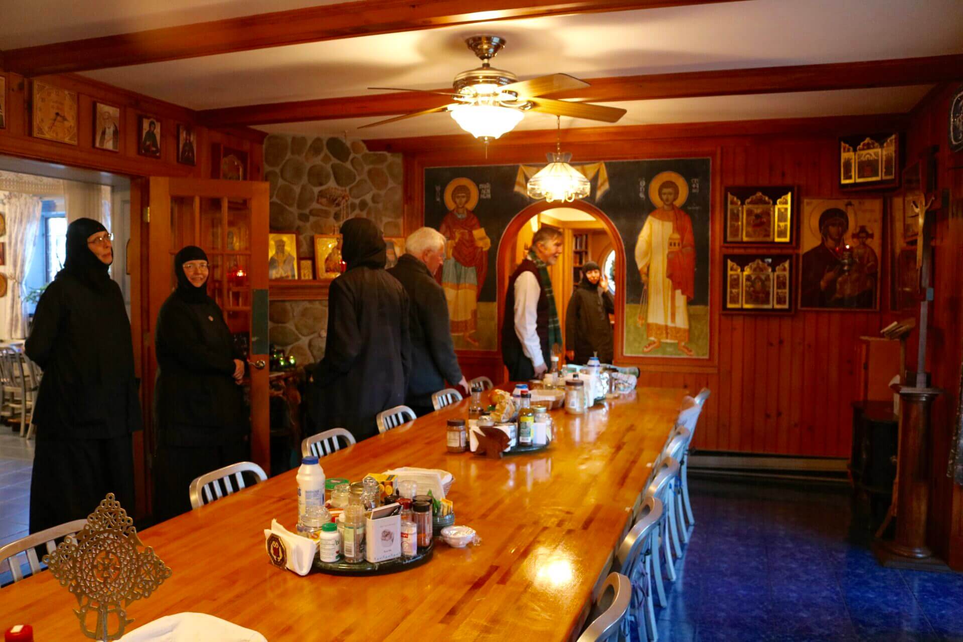 And there they were, waiting for us! There are 17 Sisters living at the Holy Nativity Convent. Our original four friends were there, smiles still totally intact, and as we toured the house, we were introduced to many more people. Mother Seraphima has stayed in touch with me ever since we first met. The convent has gifted us with delicious homemade bread made by Mother Effie, and it was SO good that I asked for the recipe. Mother Effie generously sent it to me so I could share it with everyone on the Blog, because it was WONDERFUL ~ and they sent their convent-made beeswax candles, and they prayed for my dad, and Mother Seraphima tells me she prays for me all the time (she knows I need all the help I can get), which I love, because I think their prayers go straight to heaven. So here we were, not having any idea of what this would be like except I hoped to be inspired with the spirit of Christmas. I thought, for Joe and I, lunch with best friends, and a visit to Mother Seraphima and the Sisters, would be our Christmas gift to each other.![]()