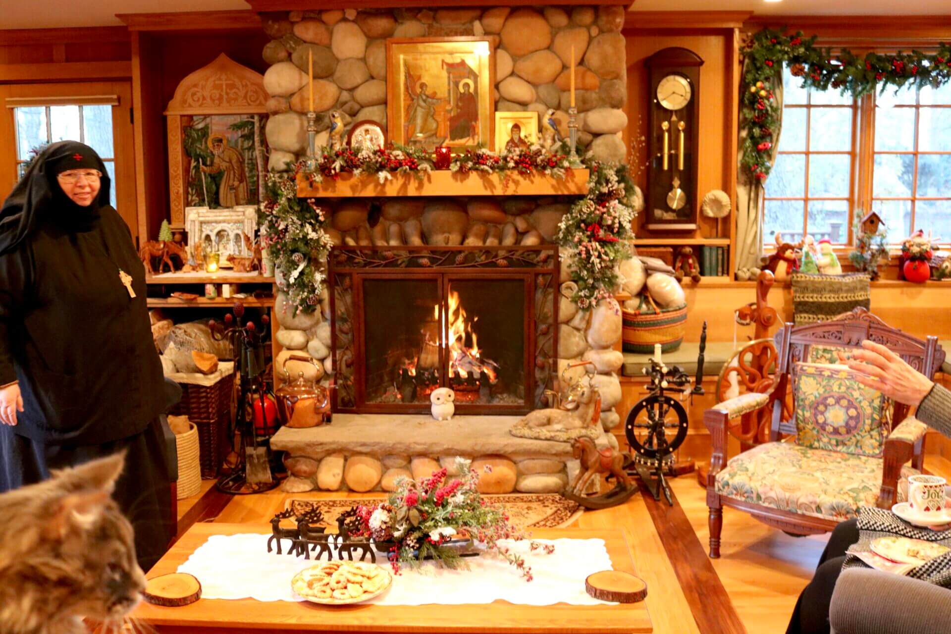 When they added their library onto the Holy Nativity Convent, they knew they wanted a room big enough for all of them to sit in front of a fire on snowy days and read, or make things, or drink tea or pet the kitties, so they built this! The most comfy room imaginable, and all dressed for Christmas. So homey on that cold blustery day!