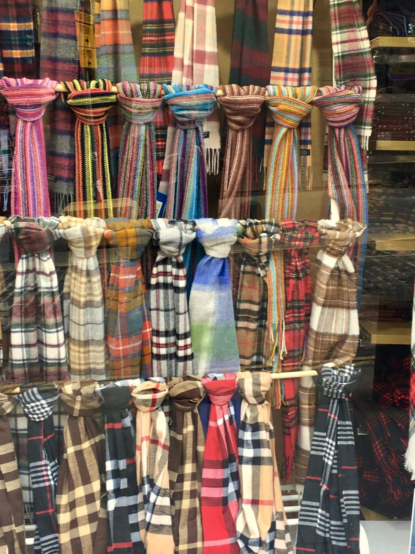 I LOVE seeing all the woolens in those Scottish stores! I am forever weary of polyester blends that let the cold in and allow all my heat to seep out. They look old-fashioned, comfy, warm, and FUN! Here in the States they would cost “over-the-top” I fear. But, a girl can still dream, right?