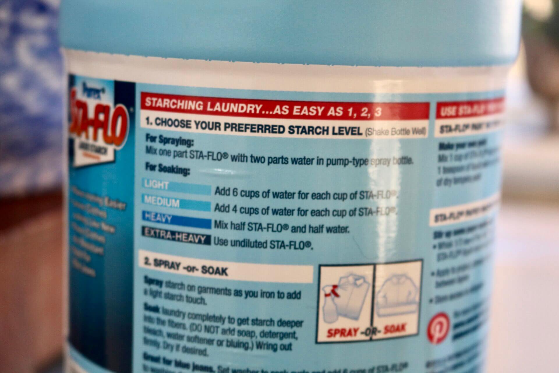 So, just in case it’s been a long time, or maybe never, since you starched something, and just in cases you’d like to try it . . . here’s how. It’s really easy. First off, you can read on the bottle how much starch to mix with how much water to make the fabric as stiff as you’d like it to be.