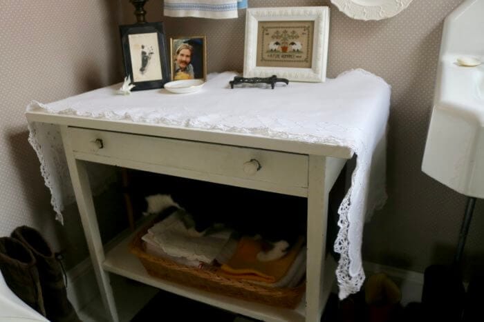 Here’s my dresser scarf, back on the table in the bathroom. Note shadow under table.