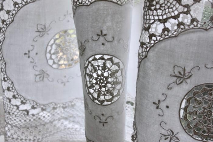 These are the bathroom curtains in that same room, made from an old lace tablecloth, the last of the ones I brought from California when I moved into my first little house on the island. Starched and perky, I won’t have to do it again for a long time. You could never do this with spray starch. Not even with the one that says, “Heavy.”