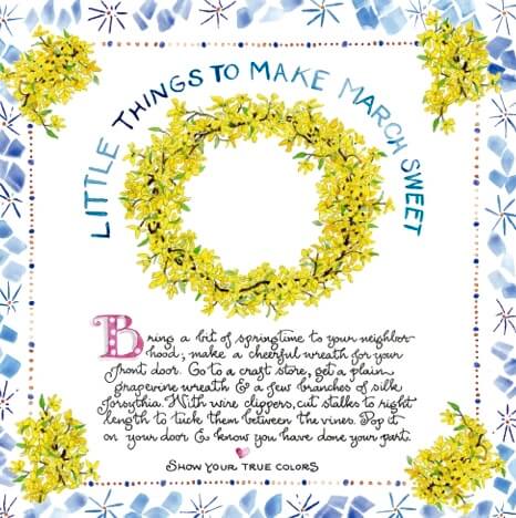 But not yet. We’re in “road mode.” But here comes spring ~ it’s time to celebrate by making your neighborhood cuter ~ here’s an idea for a Spring wreath I made for myself a while back. And yes, if you drove up my street right now, you would see my forsythia wreath on the door where I put it this morning before we left. Because I may not be there, but that’s not going to stop spring, and I want Jack to be proud of his house! And that poor beaten island could use a little floral light right now!