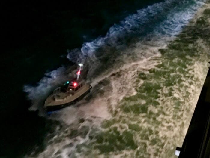 I’m unpacking, going in and out the door to the deck to take pics, and here’s one of our escort boats, that brings us in and out of the harbors . . .