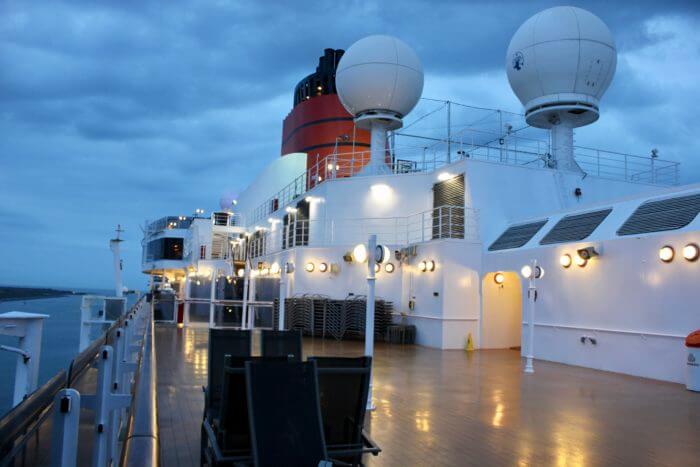 We had an excellent vantage point for life-boat counting. Look at these wonderful things. I always thought lifeboats were like row boats, open air, two wooden paddles, no engine, eight miserable huddling survivors looking fearfully at the sea, shark reflections in their eyes, wet hair glued to heads, begging for a piece of hardtack, a drip of water for parched lips. (Too many movies.) But no, these boats are heated and they have radio contact with the world. Plus, they make the perfect emergency hiding place for you stowaways, just in cases the captain shows up to try and find out why we order so many English Breakfasts every morning, ship’s almost out of bangers and beans. 😘