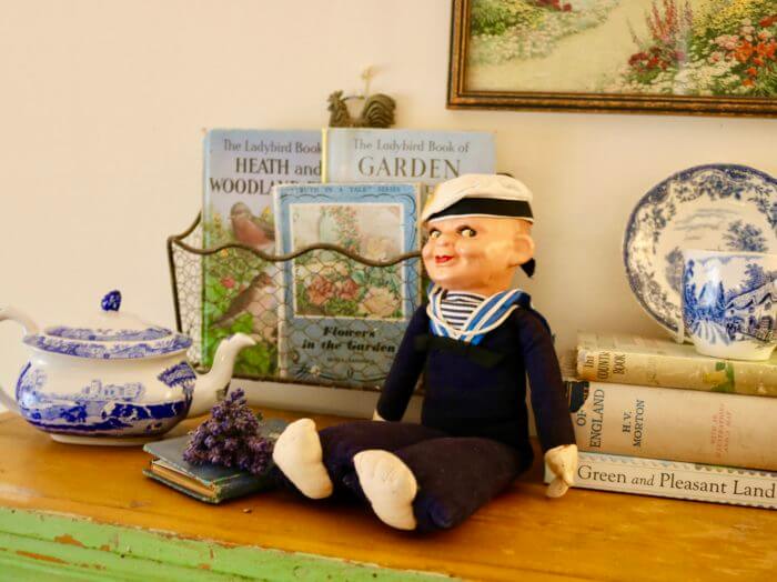 And the shelf in the bedroom she’d fixed up for us . . . I took this photo with my cell phone from the bed! You could stare at it for hours! So pretty, with sweet old books, pictures, and china.