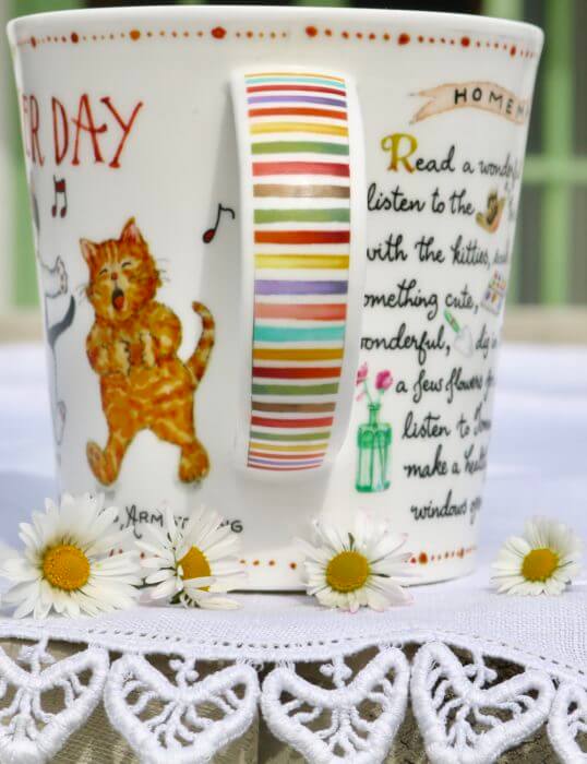 And now look! Not to drive you nuts, which I don’t mean to do, but with the lateness of the Springtime cups, we are running into a log jam. (And as Siobhan says from her peanut gallery over on the sofa, “But the good news is you can have two cups at once!” She doesn’t realize that our cups runneth over!) Anyway, this may be our last collection ~ I feel like I’m taking up too much of your cupboard space! Maybe I’ll do another one for next Christmas? We don’t get home until July 1 and I wanted to make sure our Summer cups were designed and ready to go before we left home. They sent me the first samples when we were in Cornwall. They should be shipping from England around May 20 and probably from us at the Studio around the 2nd week of June, if all goes as planned 😜. This means, for those of you collecting, we will have all four seasons! So here’s a closeup of what is coming: