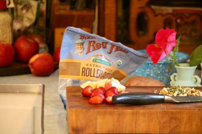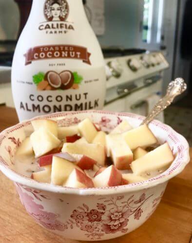 For breakfast, it’s usually Bob’s Red Mill thick-cut organic oatmeal (which, btw, is naturally gluten-free), sprinkled with crunchy, chopped mixed nuts and seeds, a tablespoon of ground flaxseed, a half-teaspoon of cinnamon, blueberries, strawberries, and/or chopped apples ~ I pour toasted-coconut/almond milk on my cereal (new to me and I LOVE it) and there’s also coconut-almond cream for my tea. Sometimes breakfast is grapes, blueberries, watermelon chunks, with good granola and a little yogurt.