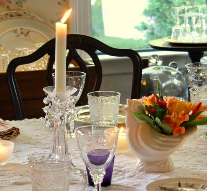Candlelight makes everything look better! More romantic, prettier colors, softer light, the food even tastes better in candlelight! And a little poem or a prayer written on a menu stand helps to set the tone. Because Thanksgiving is so wonderfully about gratitude and memory.