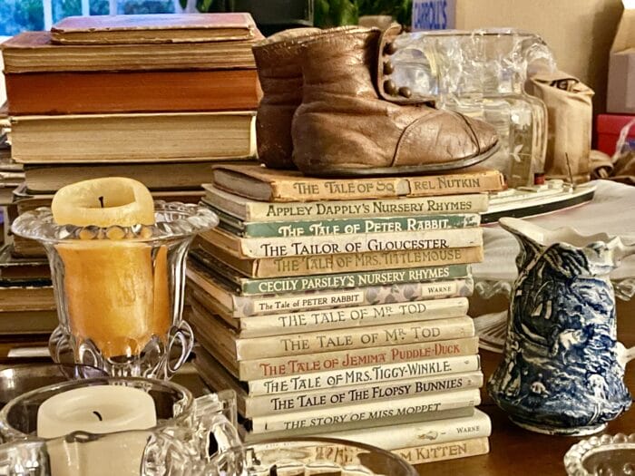 This is my stack of her little bunny books, waiting to be packed up to be brought to their new home in California, where they have been very happy on my “Heroes” shelf, where they sit imparting inspirational DNA while I do my 2027 calendars and update my Christmas Book with new art and recipes!!
