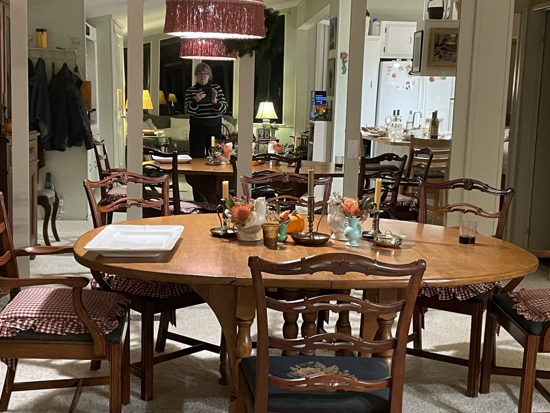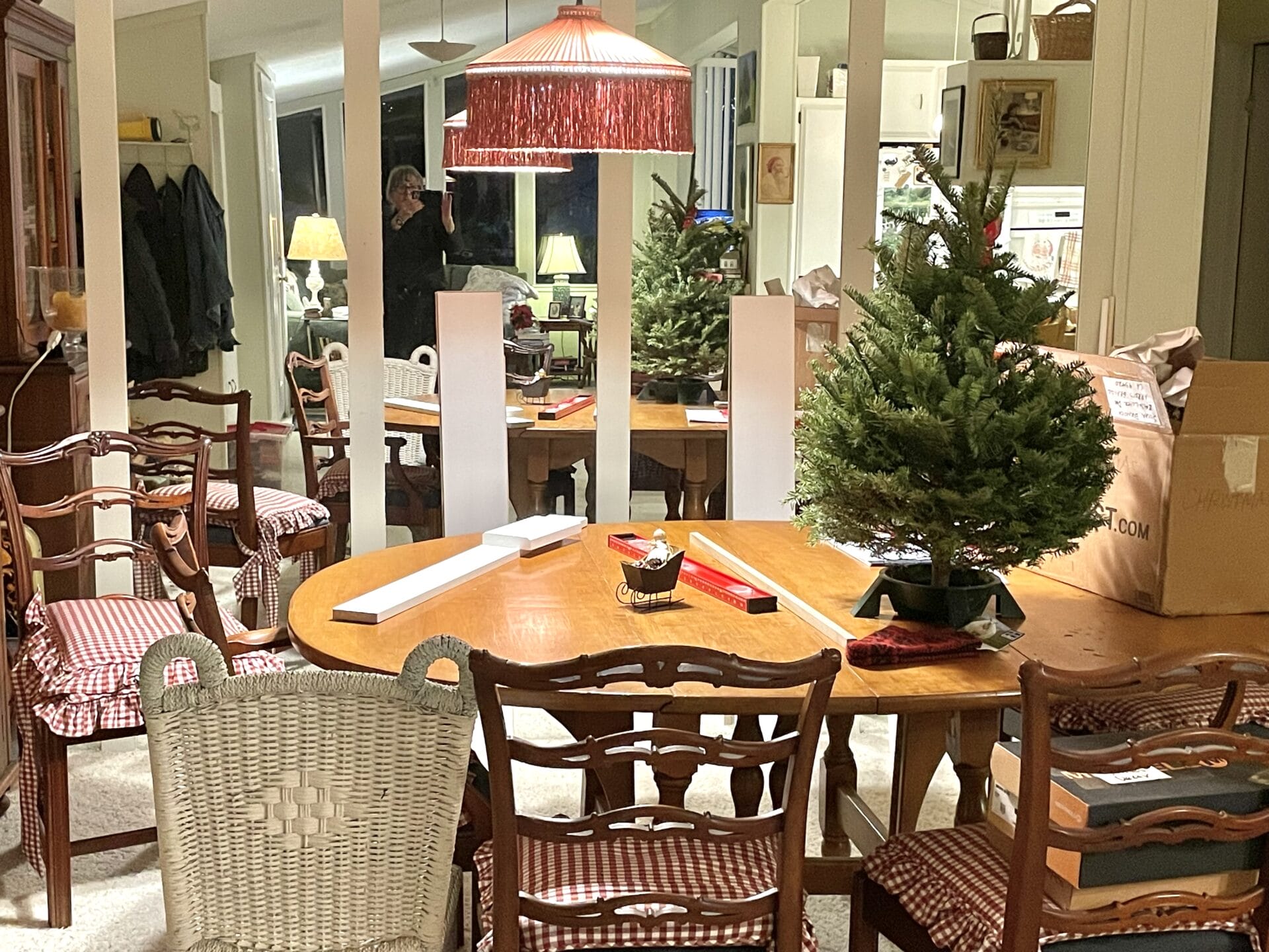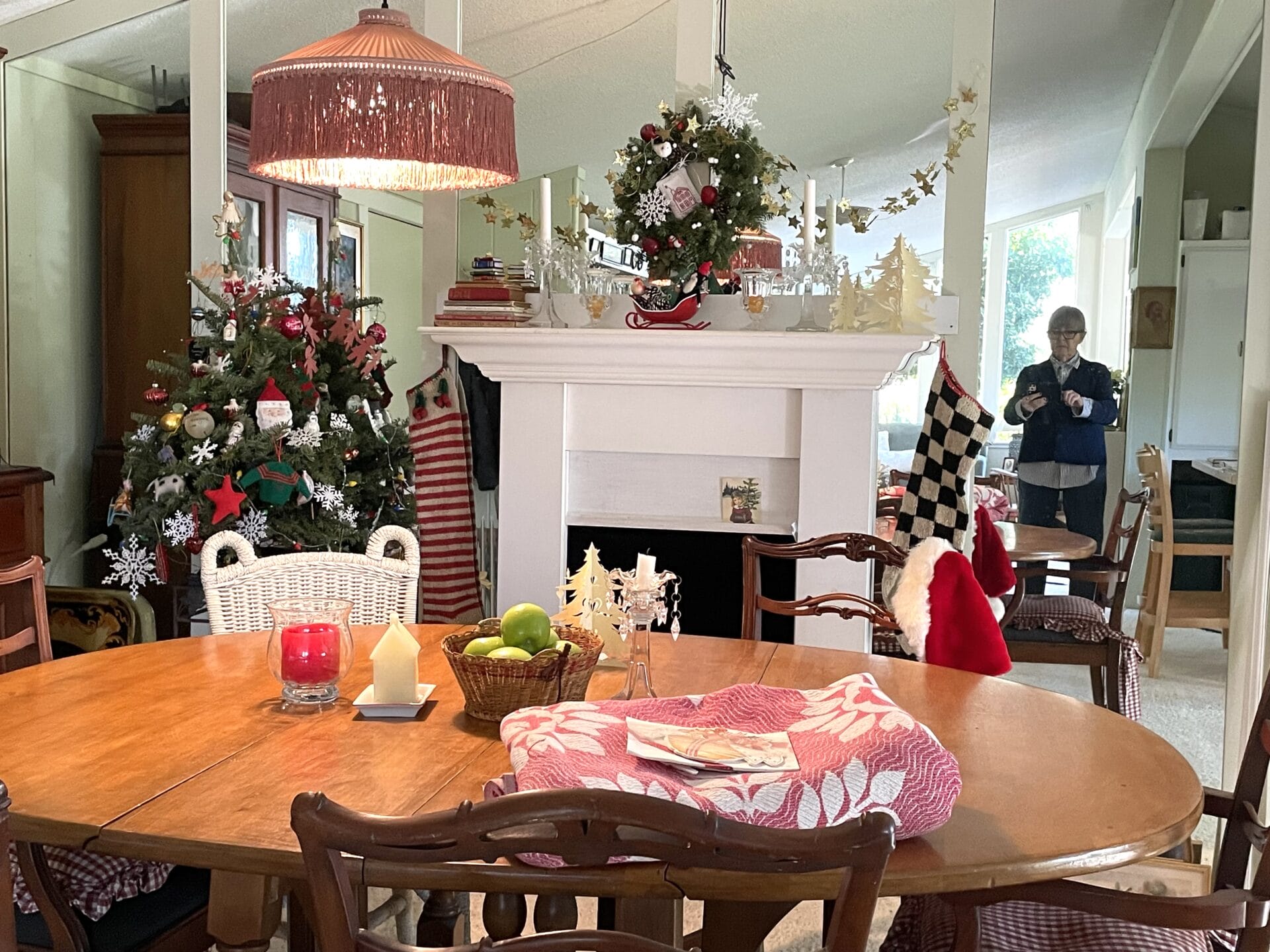 As you know last year we moved across the country into a very old 1970s double-wide in the middle of an English Garden. It wasn’t nearly as large as our old house, but we’d been wanting to downsize, and it was perfect for that! It had an open plan with lots of windows, and oddly, one entire WALL of mirrors, which normally I might not have liked, but it brought in a TON of light from the wall of windows on the other side of the room, which in turn brought in the garden, so it didn’t take long before I learned to love it a lot. Below, you can see the mirrored wall, it’s in the dining room part of the open room . . . you can see me there, reflected, and across the room behind me, you can see two lamps and tall windows in the living area, but it’s dark outside, so they are black. Sort of get it? Part of the kitchen is also reflected in the mirror. There’s a doorway to the hall on the right.