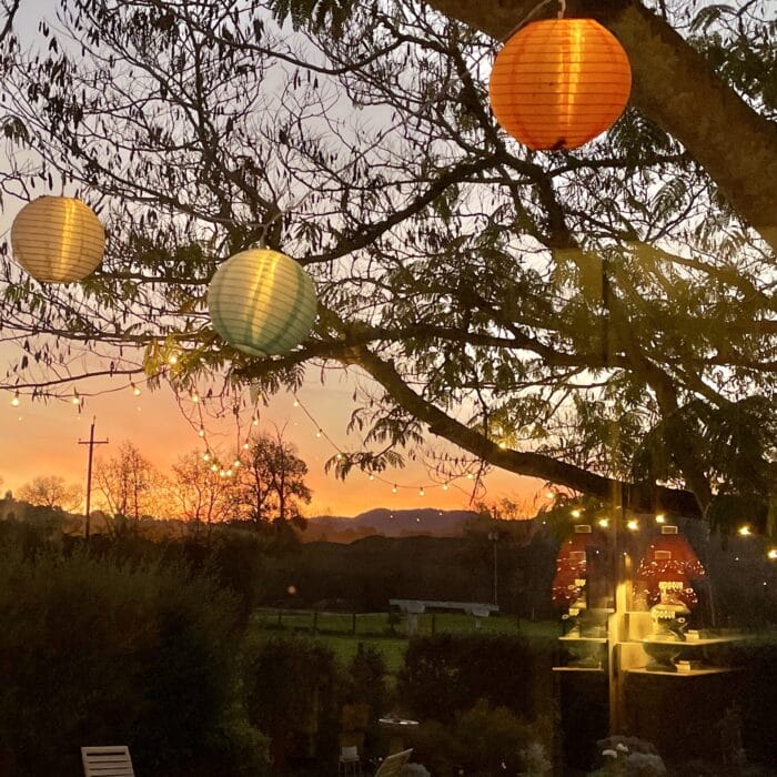 And this one, through the back window to the sunrise, through the tree with twinkle lights and lanterns we put up for Joe’s Birthday, and the reflection of the lamp on the mantle behind me . . .