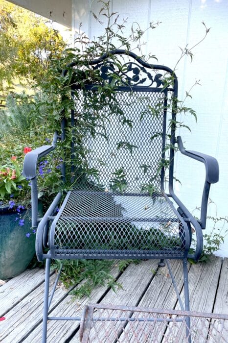 It’s a jasmine vine that found this chair on our front deck and is making a home there! I know I’m going to be sorry I let it go! It’ll probably take hours to get it all out! But it’s actually so pretty, and . . . think . . .