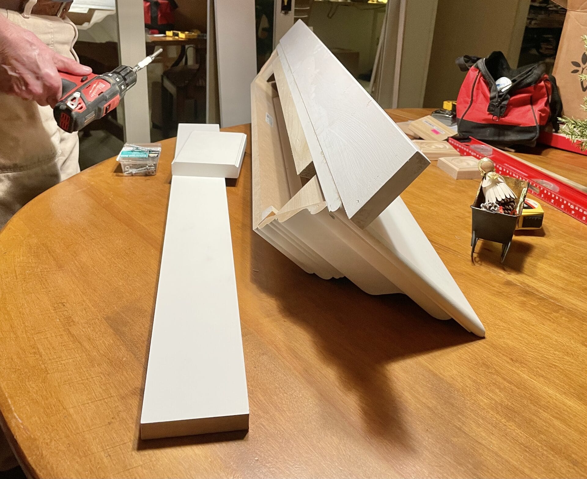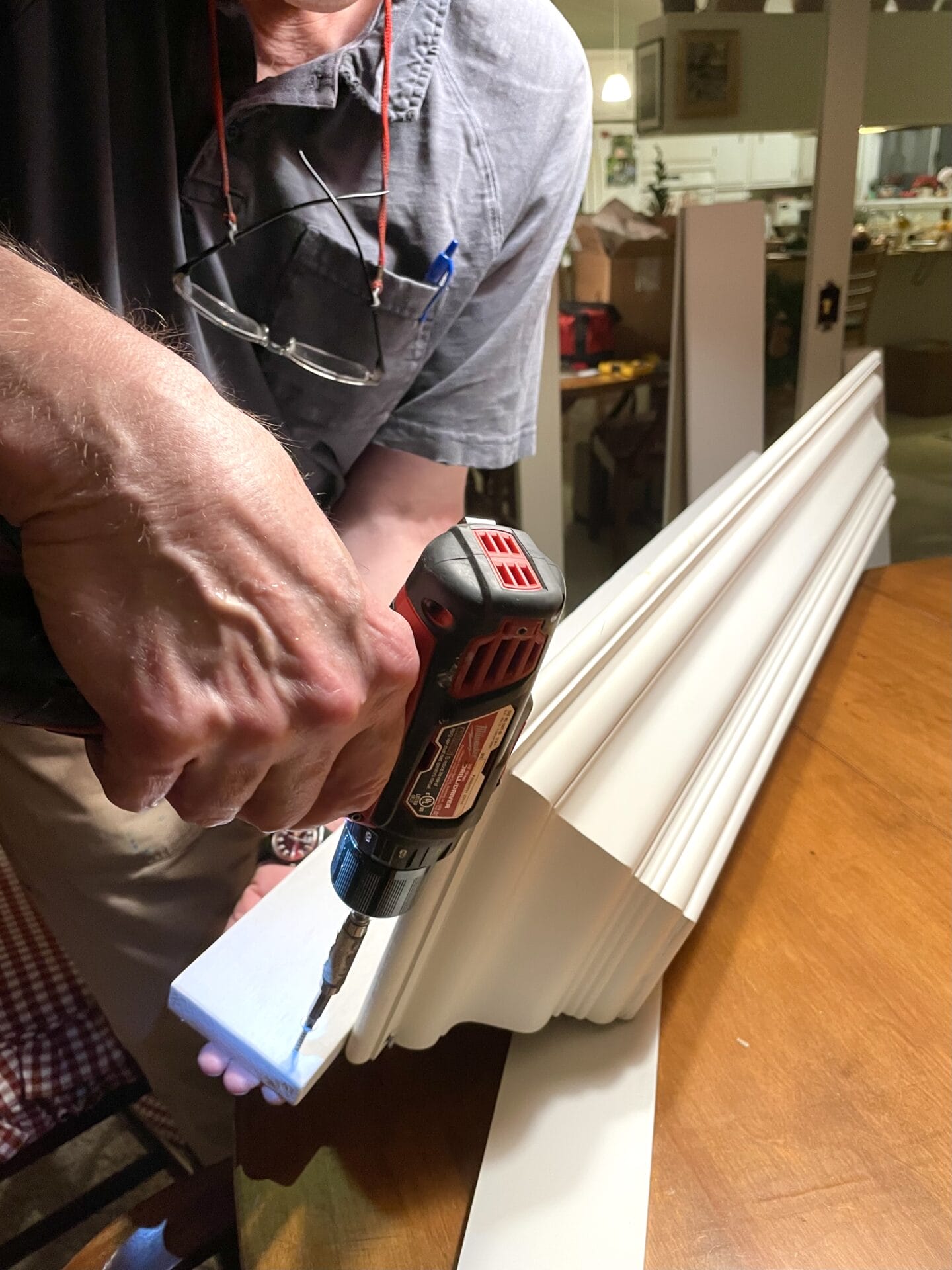 Joe began cutting, glueing, and drilling . . . I never knew his drill has a flashlight in it! How handy! And just like Michelangelo cutting his masterpieces from the marble, just like THAT, our mantle started taking shape.♥️