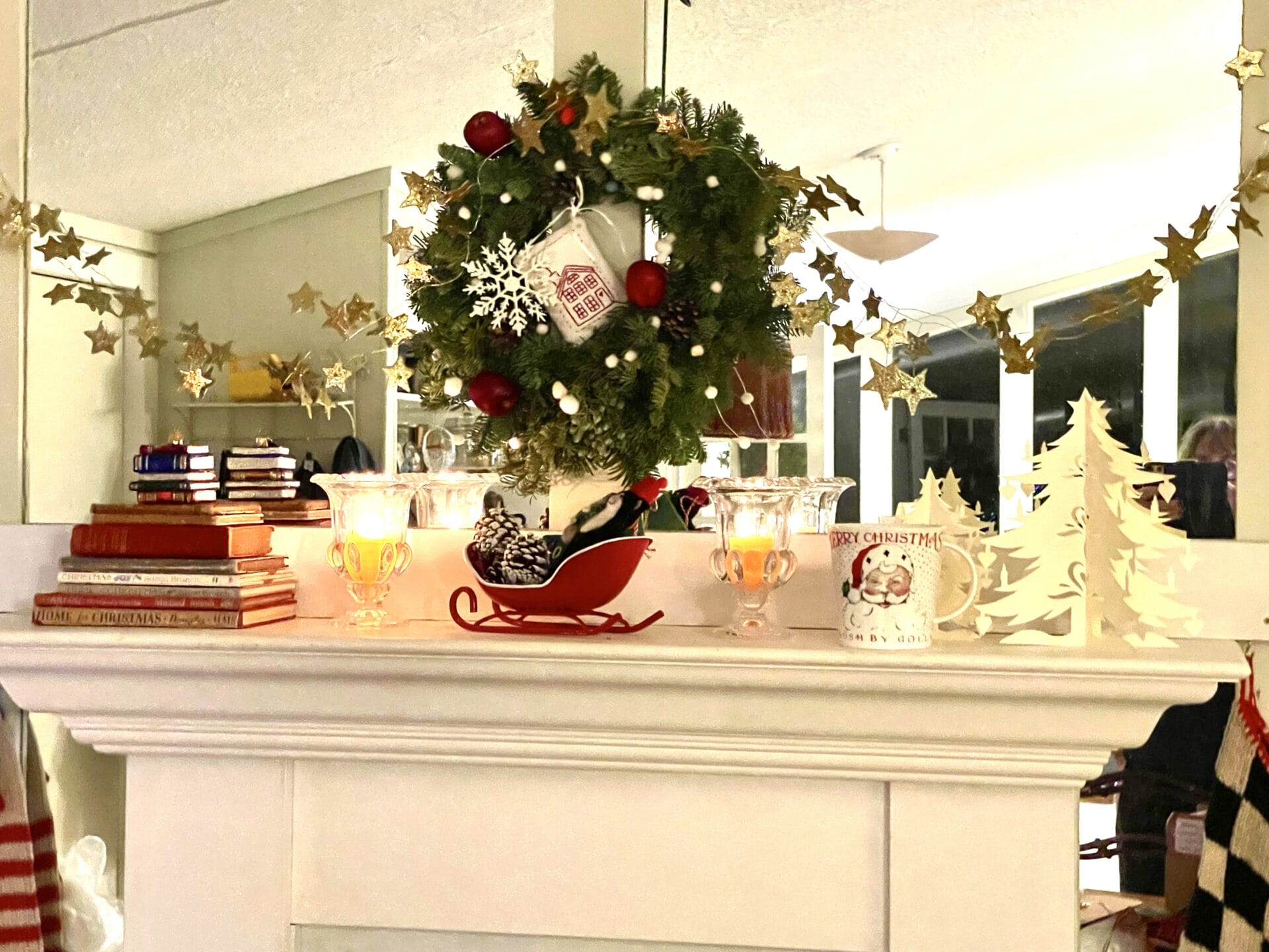 . . . we NEEDED a fireplace back there, for our cold and snowy New England winters. But we realized, that due to the mild weather in California, we didn’t need or even want a fireplace ~ it would require space! What I actually REALLY wanted, was a mantle! This came to light last Christmas, when I looked around and said, “I have no mantle to decorate! What we need is a FAKE fireplace ~ and we could put it on that mirrored wall in our “dining room! It would reflect candlelight!🕯️ It would be so cozy!” And I gently mentioned it to my darling husband, saying simply, I need a fake fireplace on yonder mirrored wall kind sir, and him replying, something to the effect of, “your wish is my command.” Anyway that’s how I remember it.💞