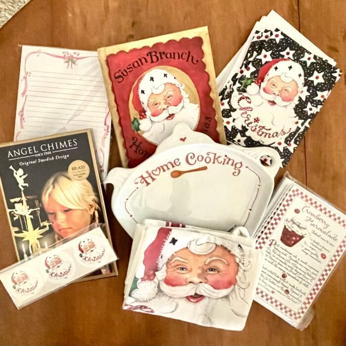 I also have a special personal gift for one lucky person🎁 . . . we’re having a drawing! Just leave a comment at the bottom and you’ll automatically be entered into a giveaway that includes all the goodies you see below: There’s a set of two holiday notepads, a box of brass-plated Angel Chimes with candles, a signed copy of my little Home For Christmas book, two designs of my Christmas Cards, and two sets of the cards I love to use for thank you cards… because they have recipes on them!♥️ There’s a Santa dishtowel, a “Home Cooking” tea-pot plate for cookies (or to hang on your wall), and some darling Santa stickers for your cards and gifts! From me to you with LOVE!💝