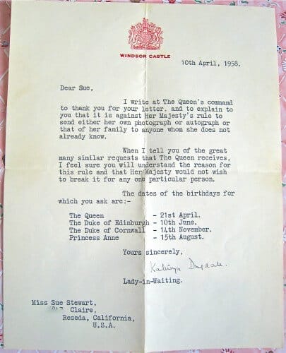 Susan, I must share with you that I (and my granddaughter Ella) have recently received one of those letters from one of the Queen’s Ladies in Waiting. We sent her (in honor of the jubilee) a congrats message and one of Ella’s drawings of the Queen. I shared with her that I watched her coronation on tv in the 50’s with my grandmother and I was now sharing it with my own granddaughter. I guess something must have touched someone (who knows who reads all those letters) because it was charming and now Ella has a letter from the queen written from Balmoral Castle. Thanks for sharing your fine book with us all.