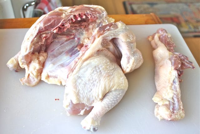 Save that beautiful backbone for chicken stock. Now you have a butterflied chicken. Easy huh?