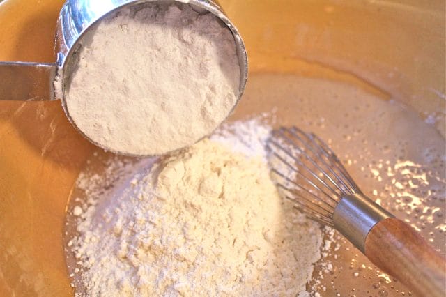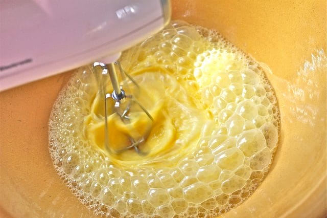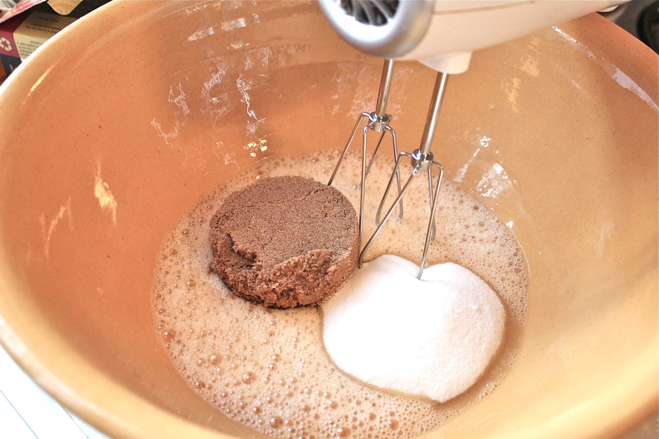 Beat 4 eggs in a large bowl . . . I’ll give you the measurements at the end so you can print them out if you like.
