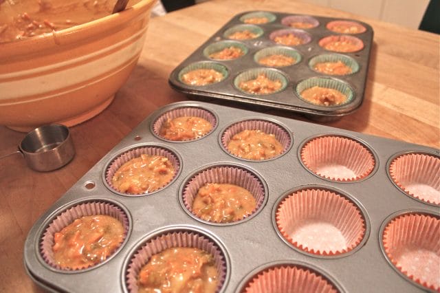 This recipe makes about 2 ½ dozen cupcakes; put liners in the cupcake tins and preheat the oven to 350°.