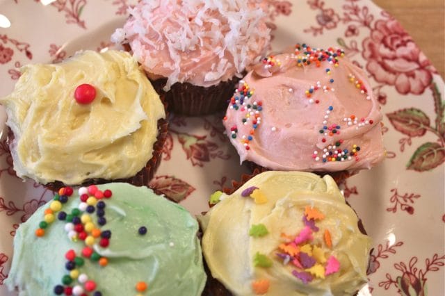 Delicious! My daughter and I made them yesterday…well, we didn’t use ALL the mixture as it made rather a lot! We separated the frosting into four cups and mixed in the colouring. Decorations this time were smarties – oops – I mean M&M’s! What a wonderful treat for spring! It was a snow day, so it turned into a Mum and daughter bonding day too. As an aside…we added a tad more flour, and cooked it at 375 degrees as we are at a high elevation here in the Rockies.