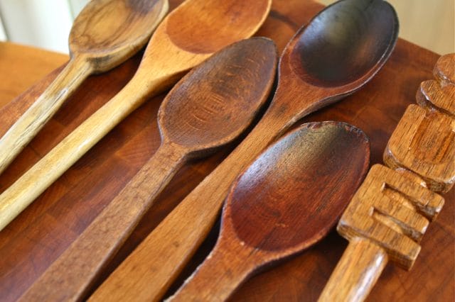 You can use coarse salt (kosher or sea salt) to scrub your wooden utensils as a first step. It removes the old crud that’s built up over the years as well as sanitizing them too. Follow that with the soap and water washing and then the mineral oil.