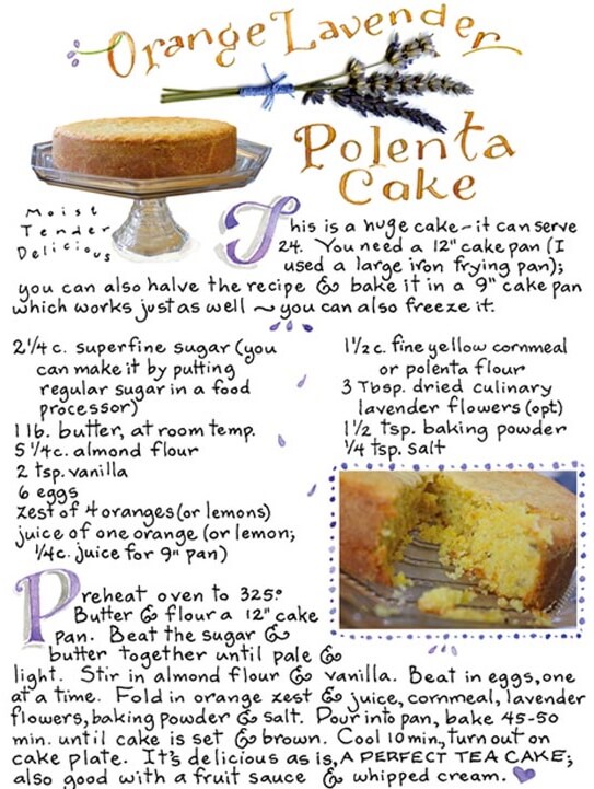 roasted chicken with my Grandma’s Bread Stuffing. I really could go on all day. A big one-dish casserole of Pork Chops, Apples, and Sweet Potatoes. Cold White Rice Salad scattered with fresh flowers and herbs. My roasted Cranberry Sauce mixed with Orange Marmalade for toast and tea. In my new book, A FINE ROMANCE, there’s a recipe from my English girlfriend Siobhan. It’s her Orange Lavender Polenta Cake, moist with the little crunchy bits, it’s gluten-free and it serves about twenty-four people so it’s perfect for a tea party. You would like the recipe? Oh yes!