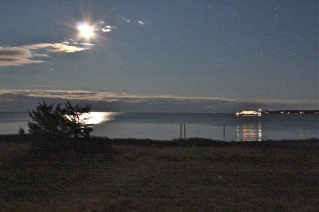 We became moonchasers, compelled to follow the moon, the ferry, the stars! We got the car and drove out West Chop to the Meadow for a clear view of the sound in time to see the ferry steaming toward Woods Hole.