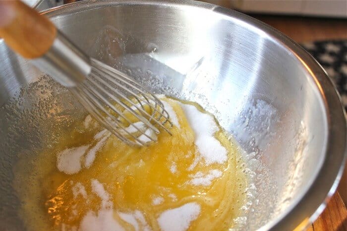 2 eggs 3/4 cup of sugar Mix on medium high with electric mixer.
