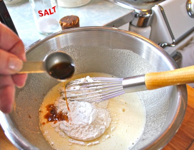In goes the first half cup of flour, the baking powder, salt, and vanilla.