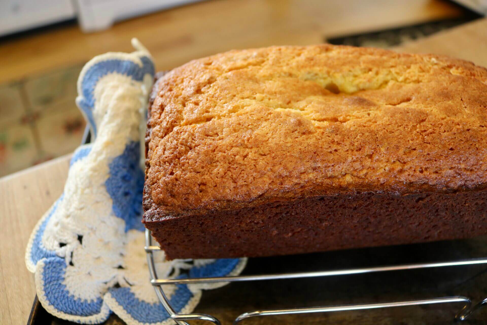 . . . until lightly brown and a knife inserted in center comes out clean. Remove from oven and set the cake upright on a wire rack to cool ten minutes. (Put the rack on a cookie sheet so when you spoon on the glaze (below), the pan will catch the drips).