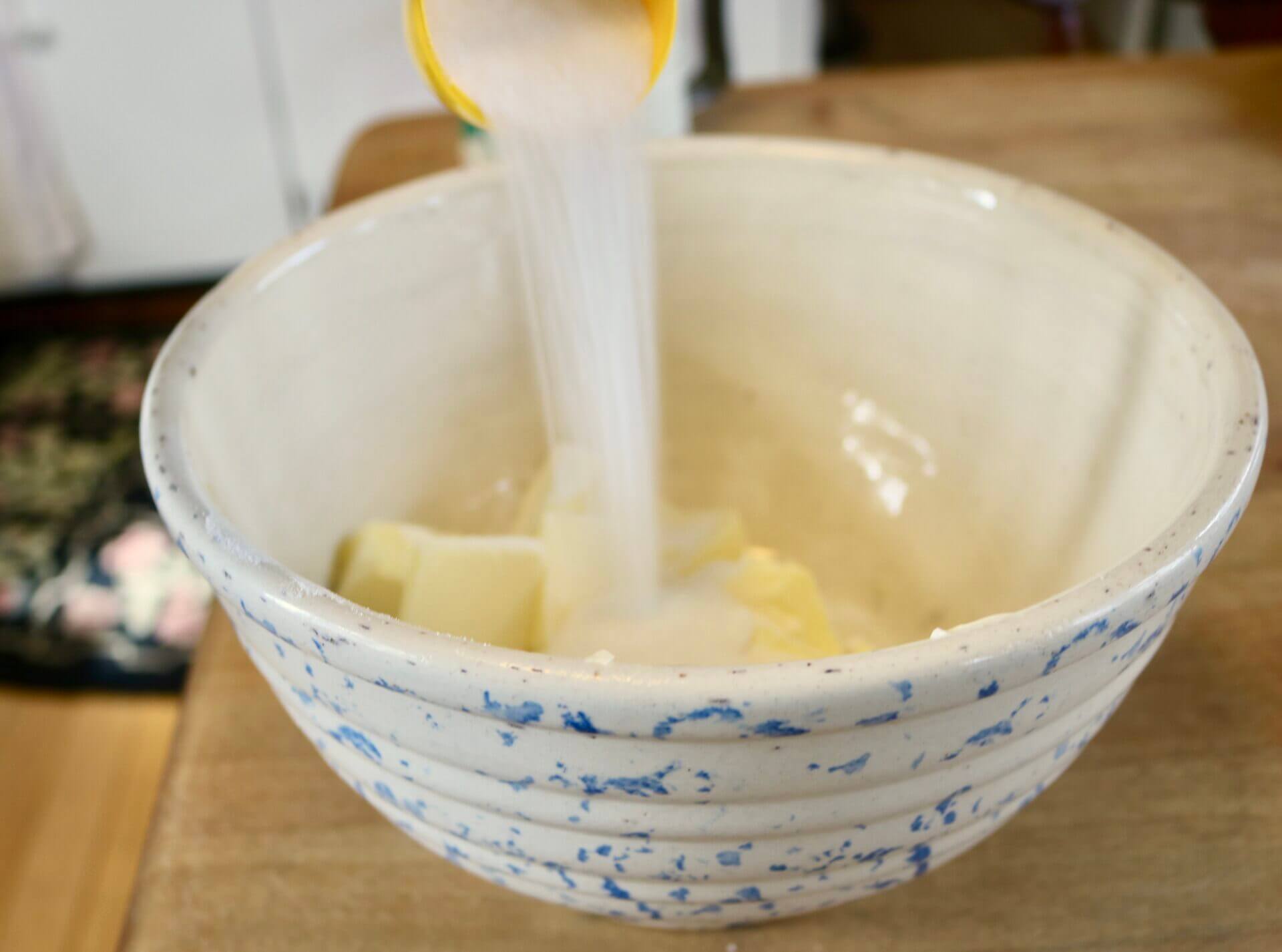 Preheat your oven to 350 degrees and butter a loaf pan. Into a med-sized mixing bowl, pour ¾ c. granulated sugar over a stick and a half of room temperature unsalted butter.
