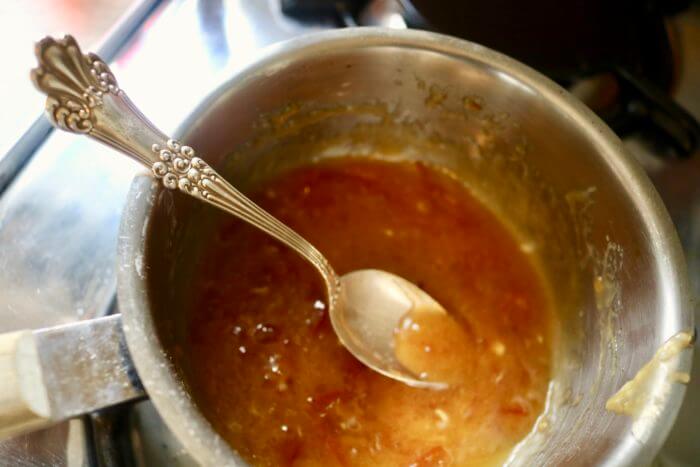 I’ll put the full recipe at the bottom, so you can print it out. Don’t worry about amounts here, this is just for the basic How To. First you start with a jar of thick-cut orange Marmalade. Luckily we had brought this home from England with us . . . and it was perfect. But you can get the good stuff in any grocery store.