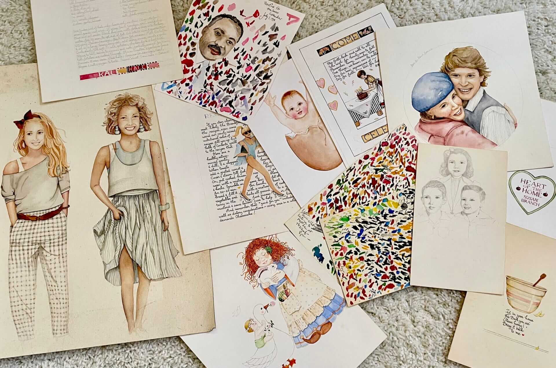 book, Heart of the Home ~ I couldn’t throw them away! As you can see, I’ve always been trying to learn to paint people . . . either from magazine pictures, or made up, or from real photos, that’s a pencil drawing of me and my two brothers as children on the right… and that’s a portrait of our friends, the Schwiers, above it. It looks like Peggy, but definitely not Bob (except for the hair) ~ which is why it’s still here! And you can see me practicing Martin Luther King Jr. before I put him in my 2000 wall calendar! I think I spot Vanna in the center of the page, in the sunglasses, next to the baby jumping out of the egg (which never made it into my Baby Love book). That painting above is an original, painted on d’Arches paper, not even signed yet, just sitting in a box, I don’t know why! I’ll have to think of something special to do with it!🤔